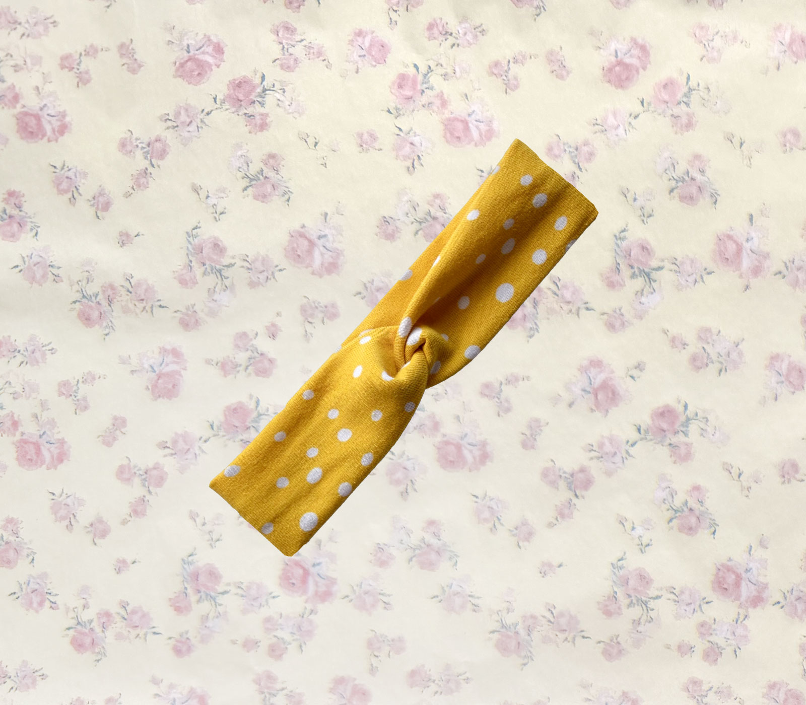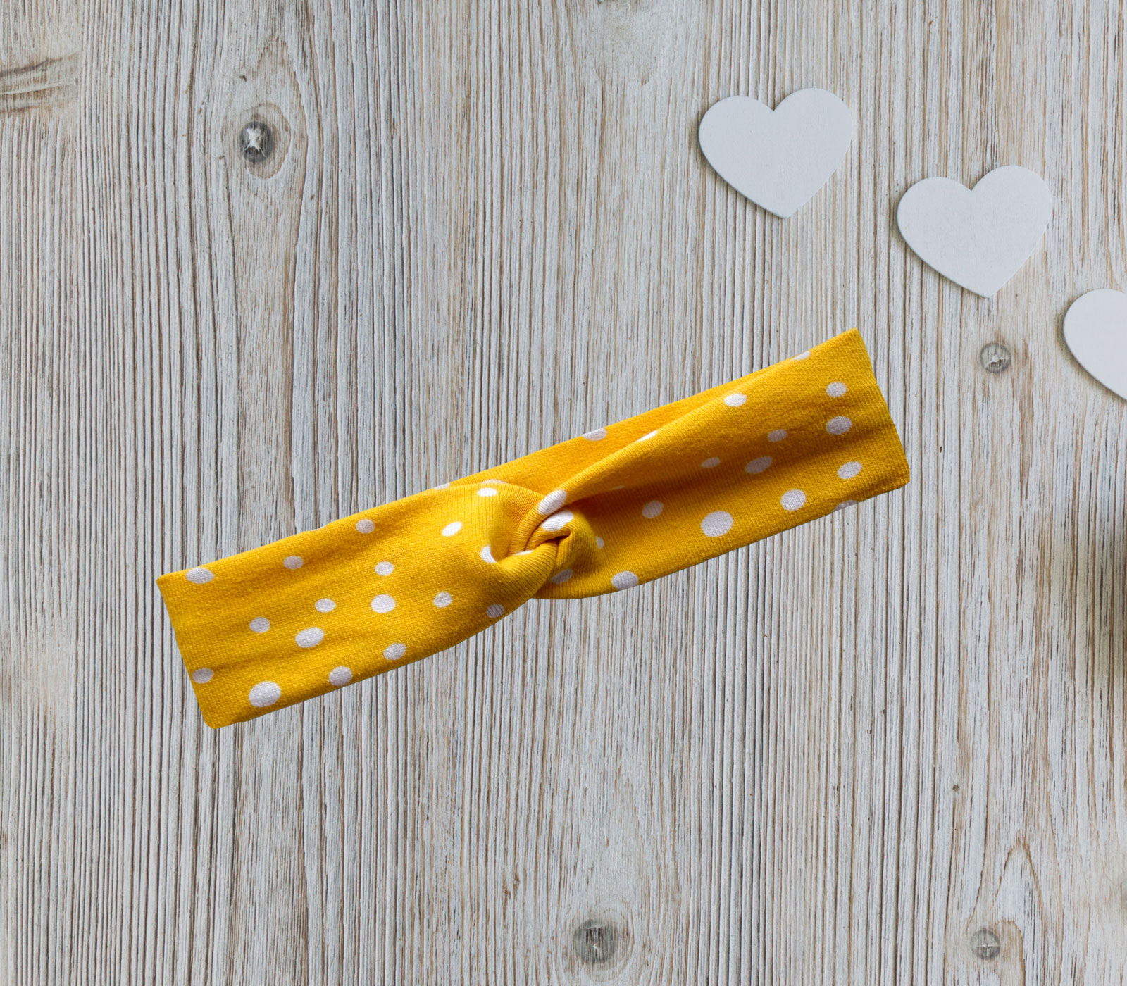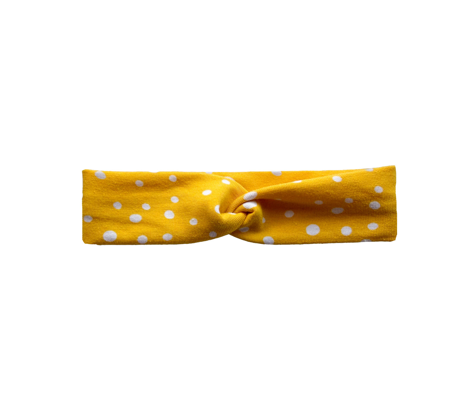 Pretty Babies Headband Yellow Spots design, lots of white spots on a vibrant yellow fabric.