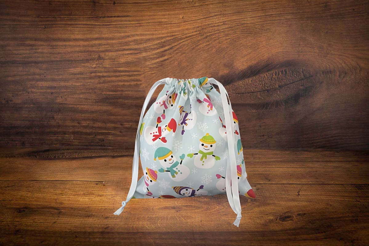 The gift bag has a design of colourful Snowmen wearing scarfs and hats on a pale blue fabric