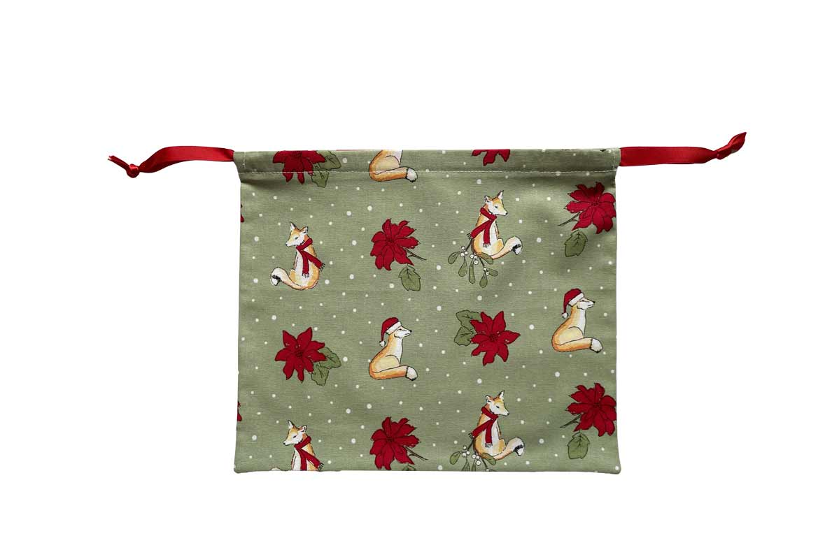 Christmas Foxes Gift Bag. Cute foxes in Christmas hats and pretty red flowers on a green fabric