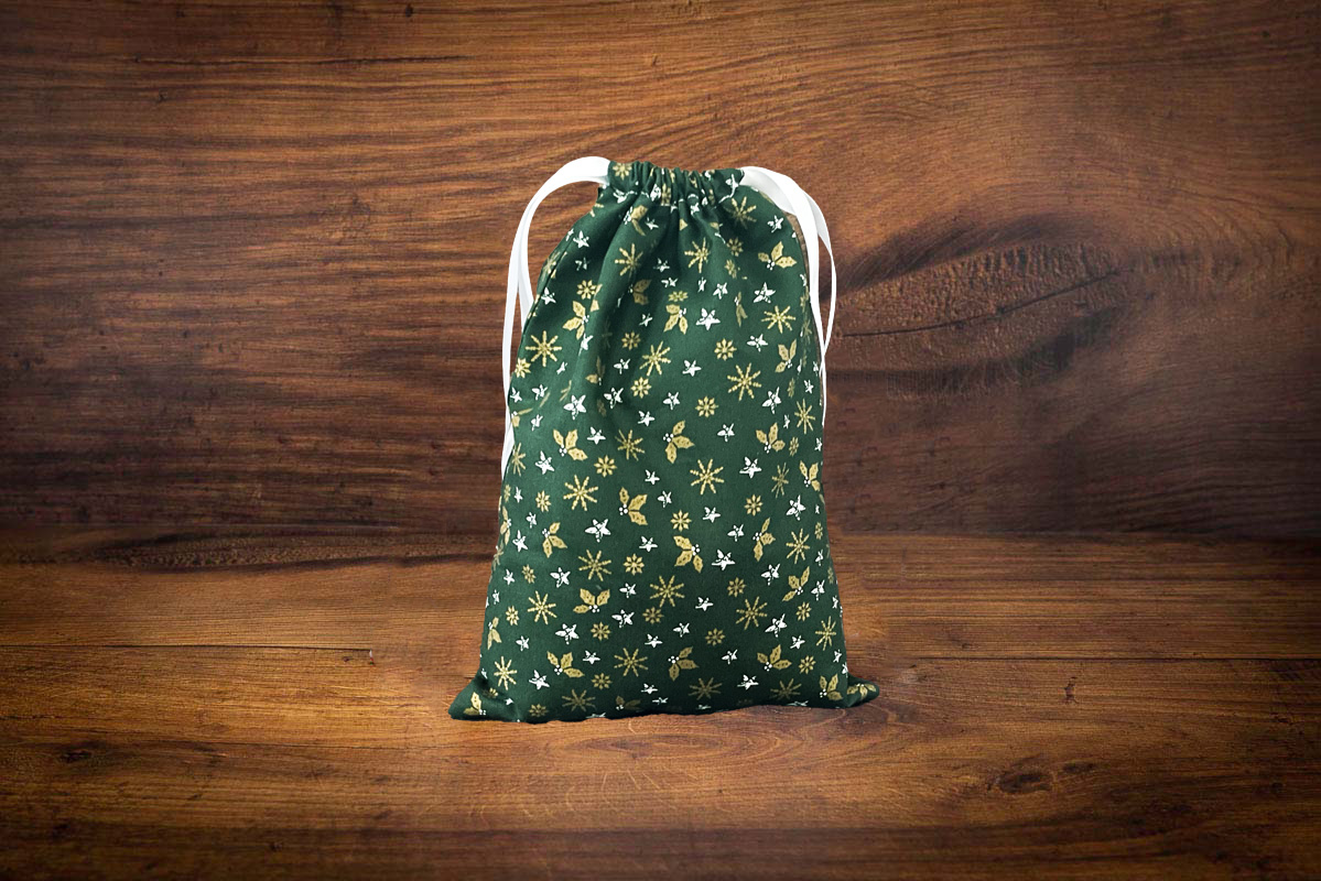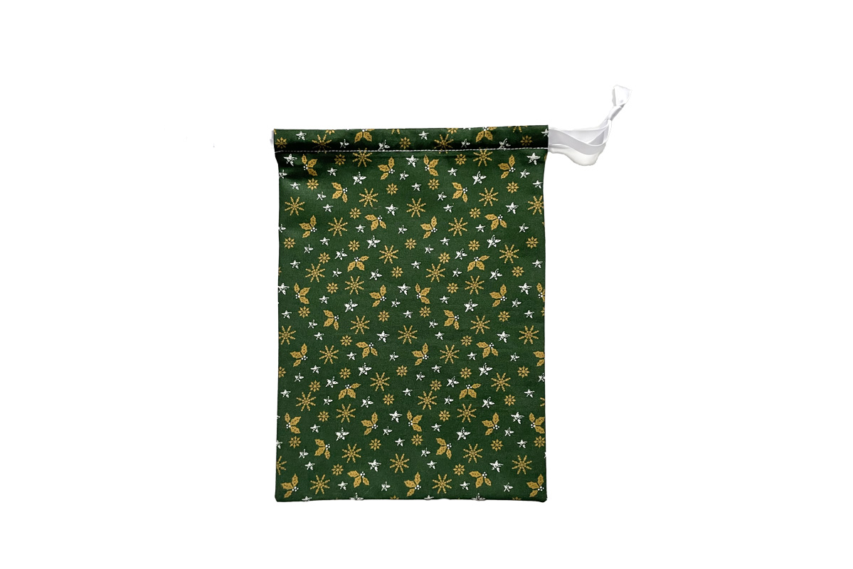 Reusable Eco-friendly Christmas Gift Bag with a Gold Holly & Snowflakes design on a green fabric
