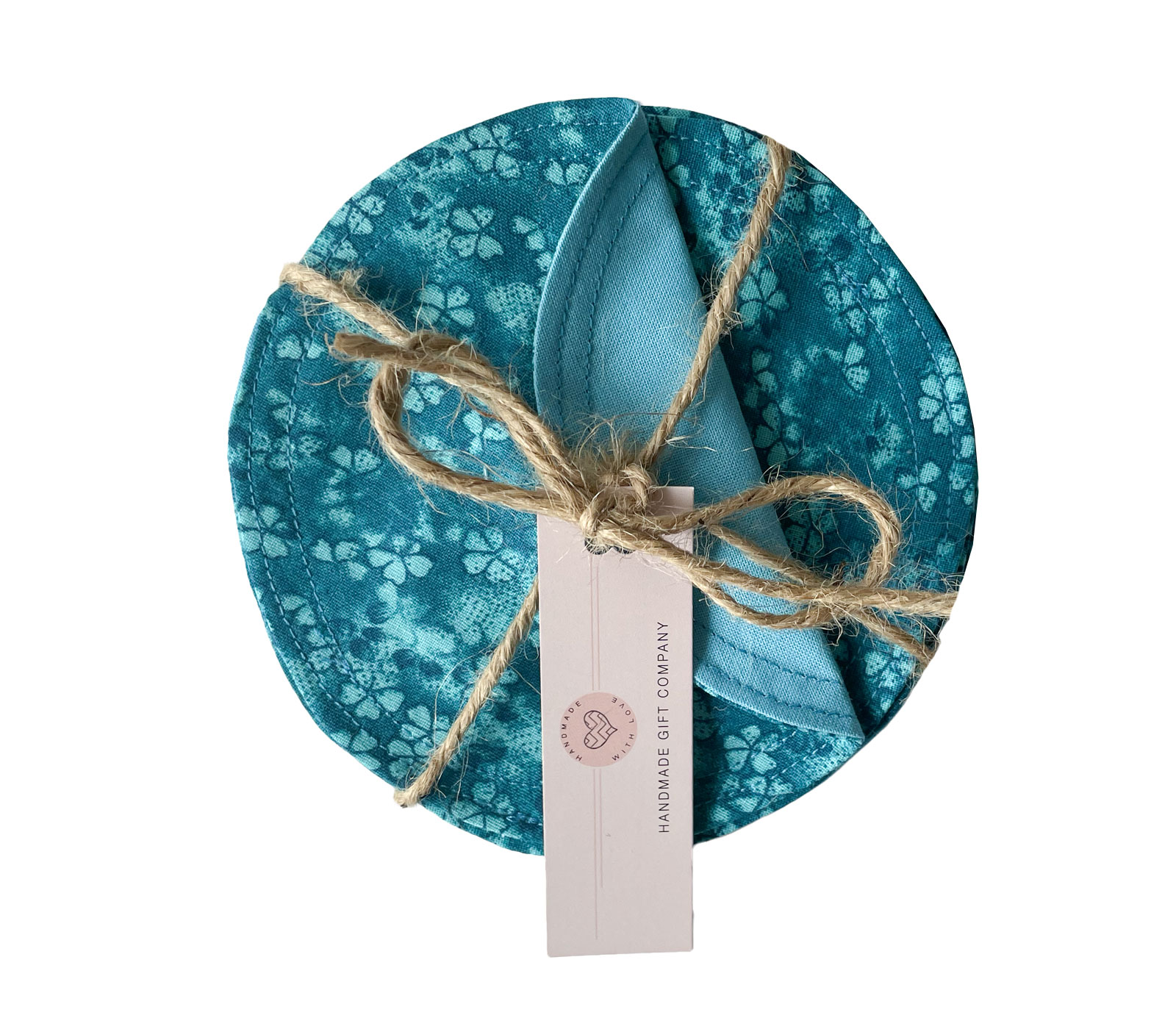 This set of six coasters features a pretty floral design on a lovely blue fabric. Reverse of the fabric is a plain blue which makes them both functional and decorative. Crafted for versatility, each coaster can be used on either side, offering two different looks to suit your mood or table setting. Perfect for protecting surfaces while adding a playful, culinary-inspired touch to your home, these coasters are ideal for any kitchen or dining area.