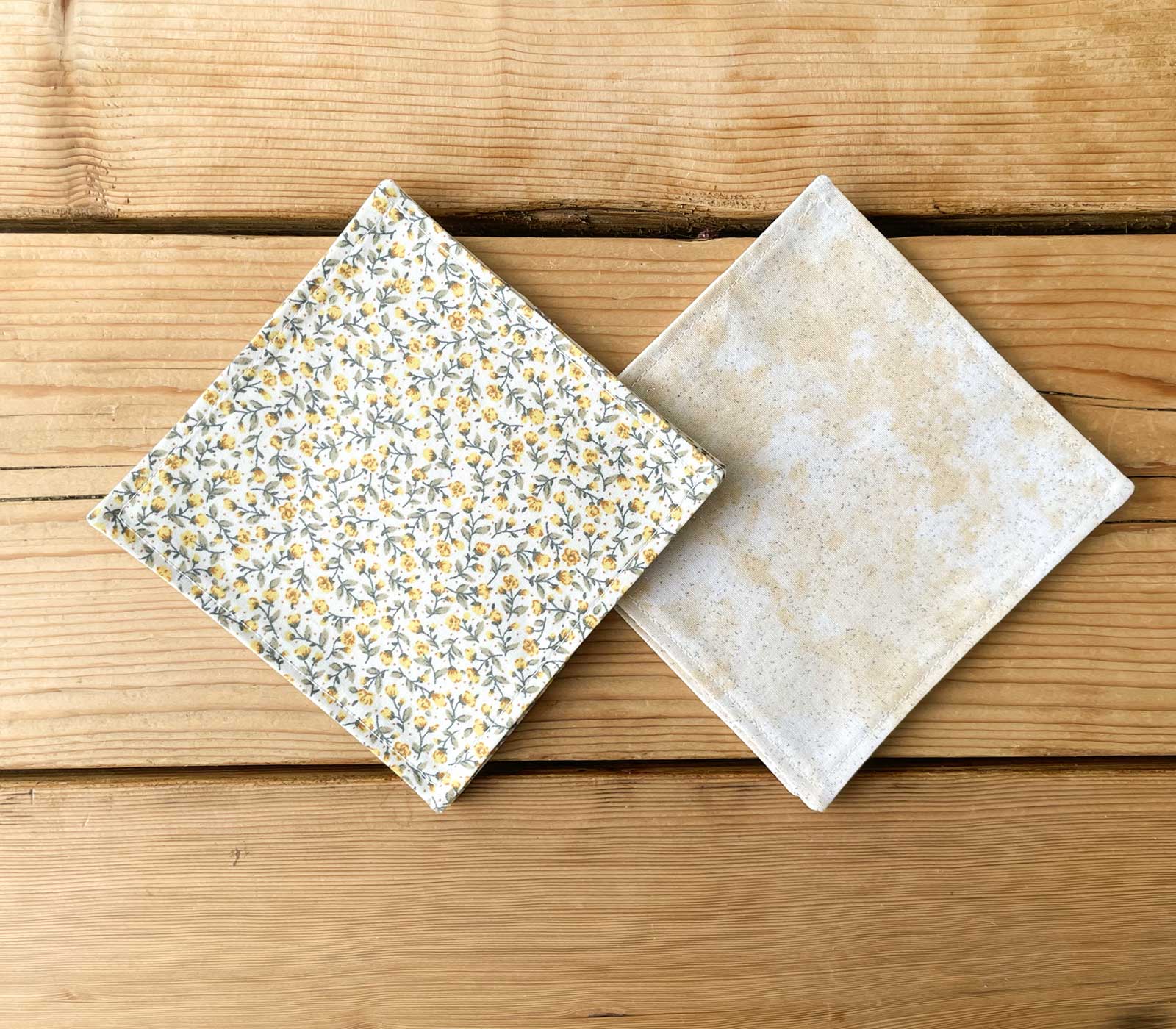 This set of six reversible coasters features a lovely yellow and beige floral design on one side, with a yellow reverse with shiny silver bits in the fabric making them both functional and decorative. Crafted for versatility, each coaster can be used on either side, offering two different looks to suit your mood or table setting. Perfect for protecting surfaces while adding a playful, culinary-inspired touch to your home, these coasters are ideal for any kitchen or dining area.
