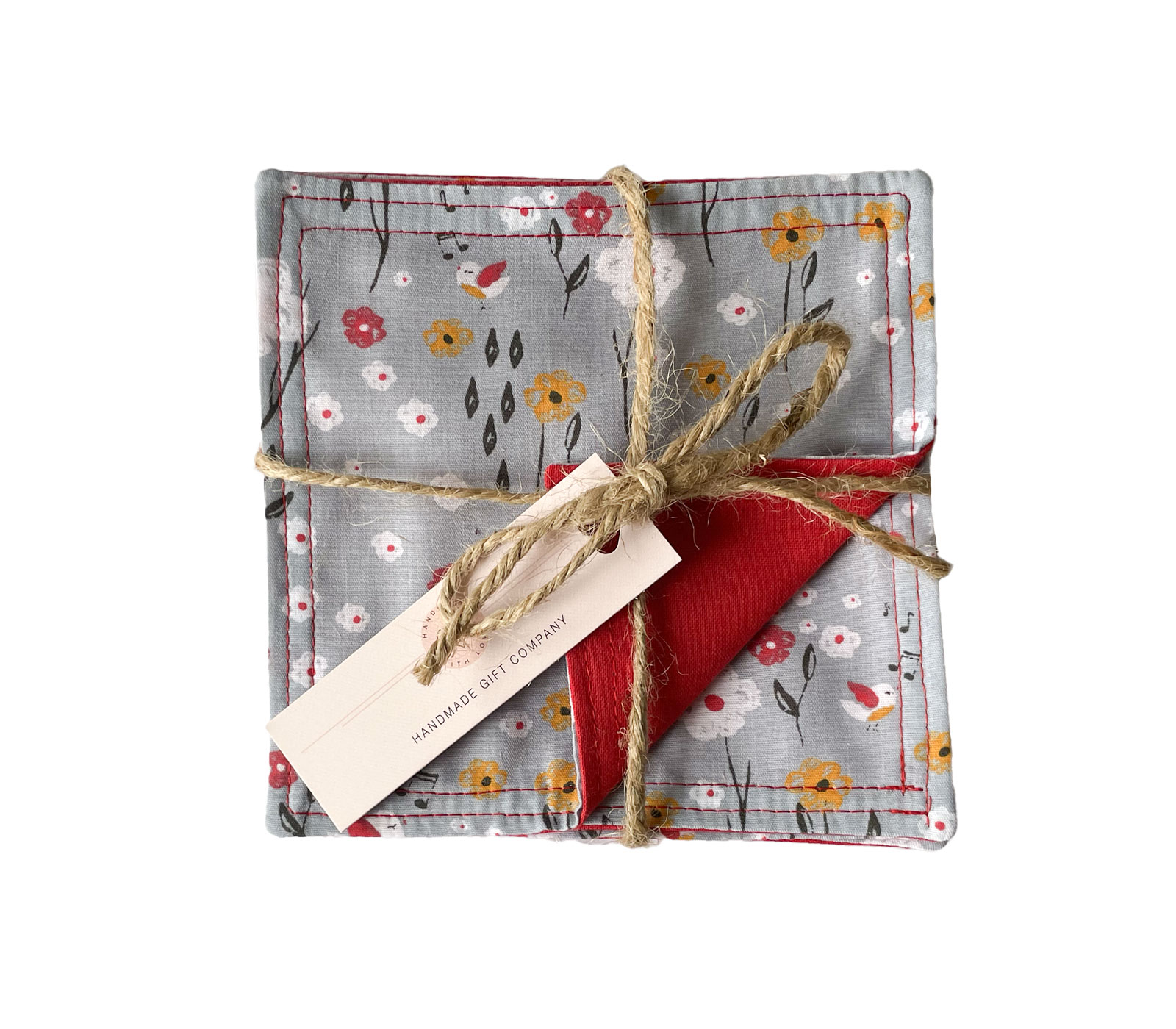 This set of four reversible coasters features a red and grey floral design on one side, with a red fabric reverse making them both functional and decorative. Crafted for versatility, each coaster can be used on either side, offering two different looks to suit your mood or table setting. Perfect for protecting surfaces while adding a playful, culinary-inspired touch to your home, these coasters are ideal for any kitchen or dining area.