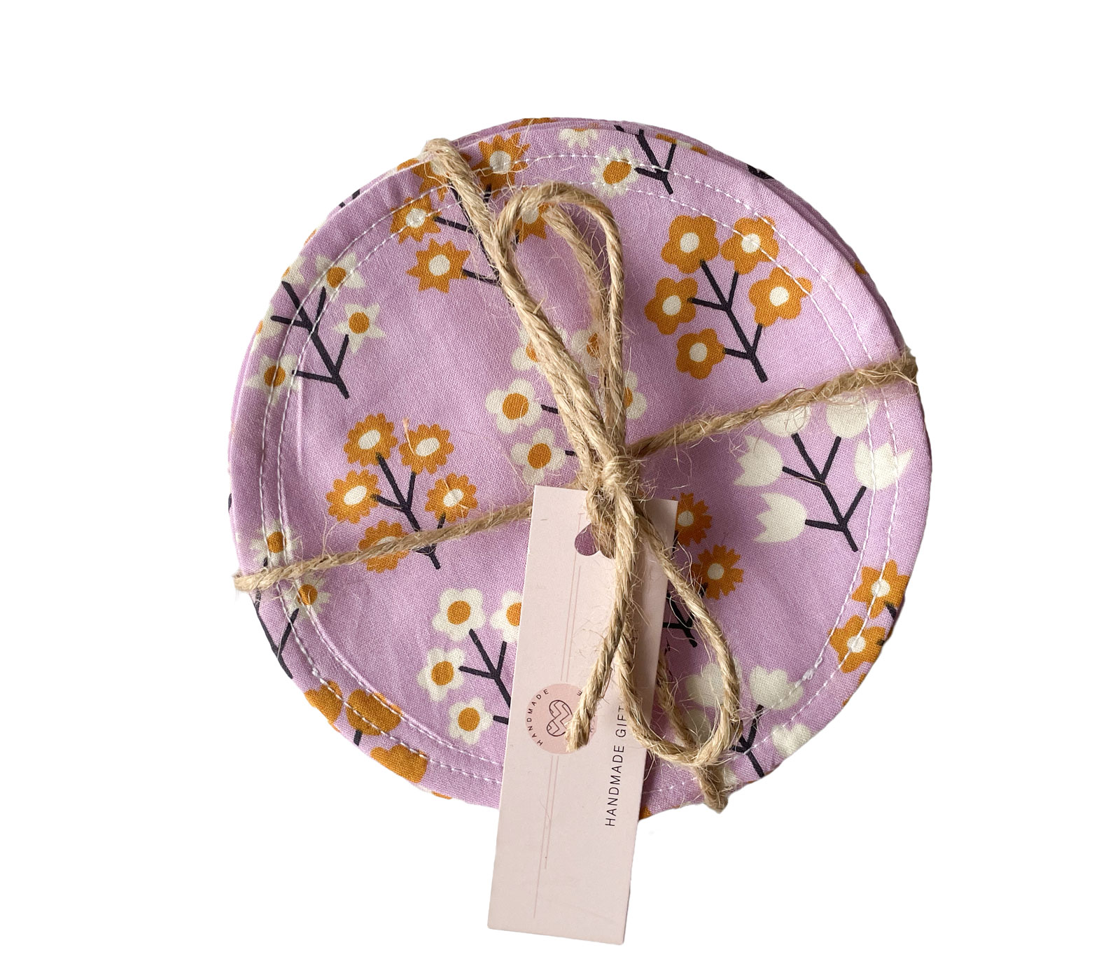 Lovely Handmade Set of 4 Round Coasters Lilac Floral Design.