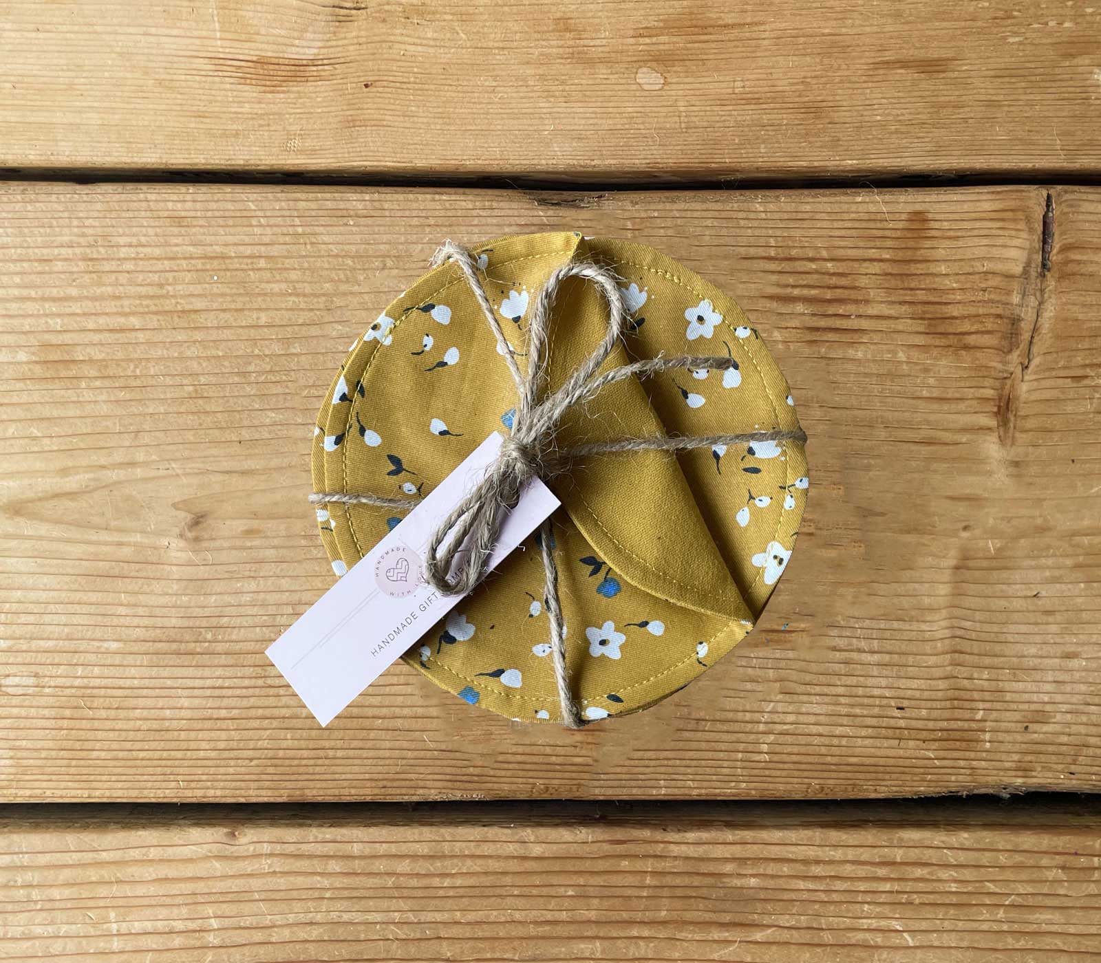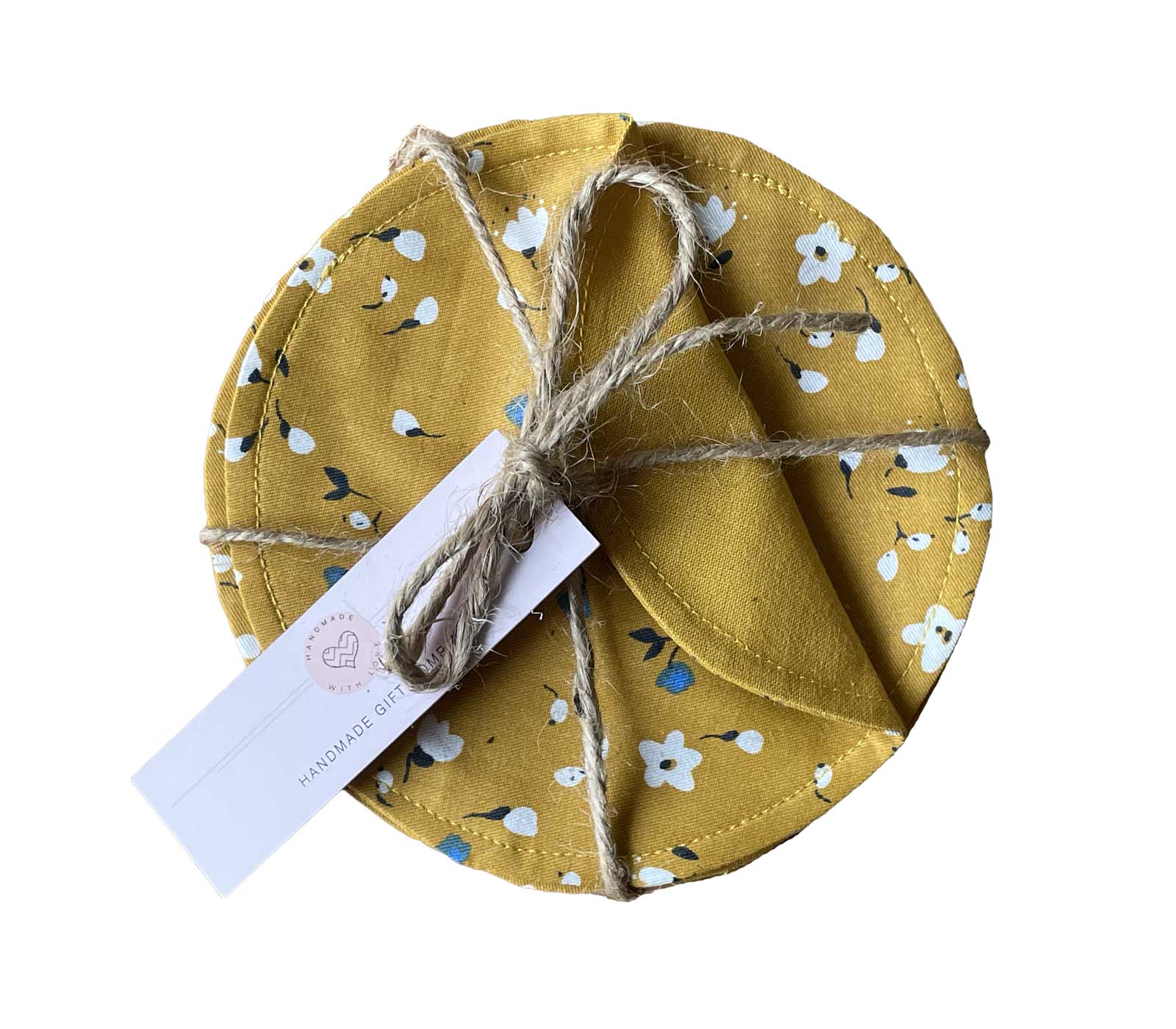 This set of six reversible round coasters features a floral design in a mustard colour. Reverse of the fabric is a plain mustard colour making them both functional and decorative. Crafted for versatility, each coaster can be used on either side, offering two different looks to suit your mood or table setting. Perfect for protecting surfaces while adding a playful, culinary-inspired touch to your home, these coasters are ideal for any kitchen or dining area.