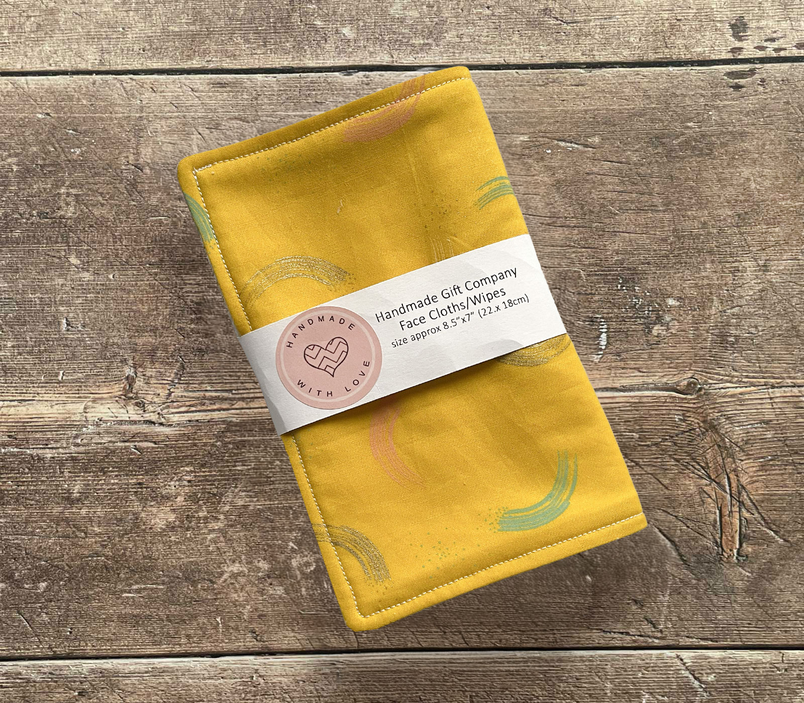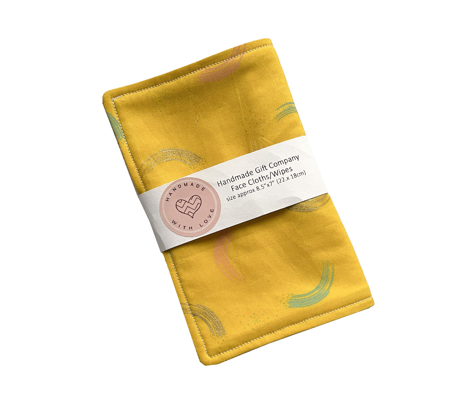 Handmade face cloth with a lots of colourful rainbows on a mustard colour fabric. This item comes as a pack of 2 face cloths in the same design