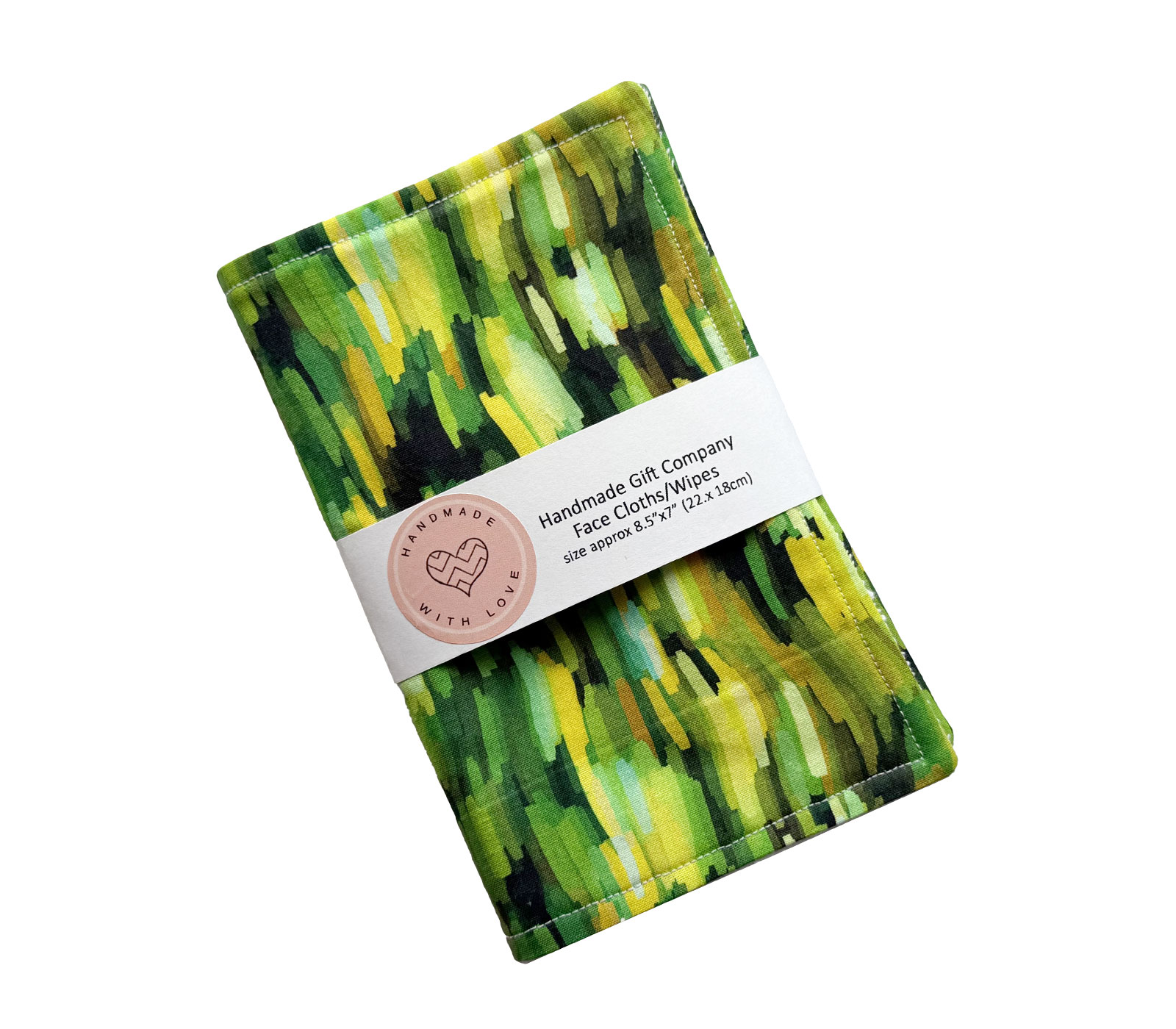 Lovely Handmade Face Cloths/Wipes with a various green colour abstract design.
