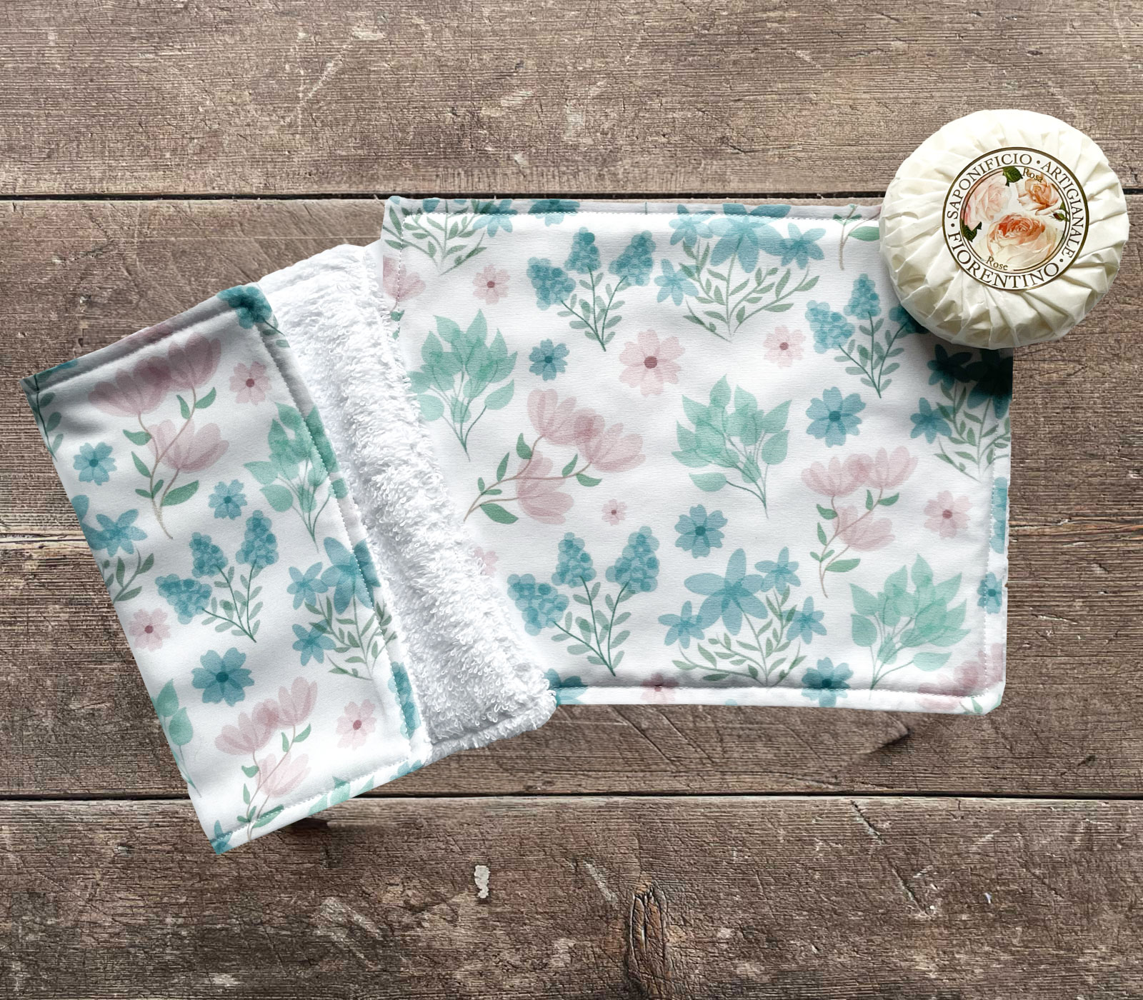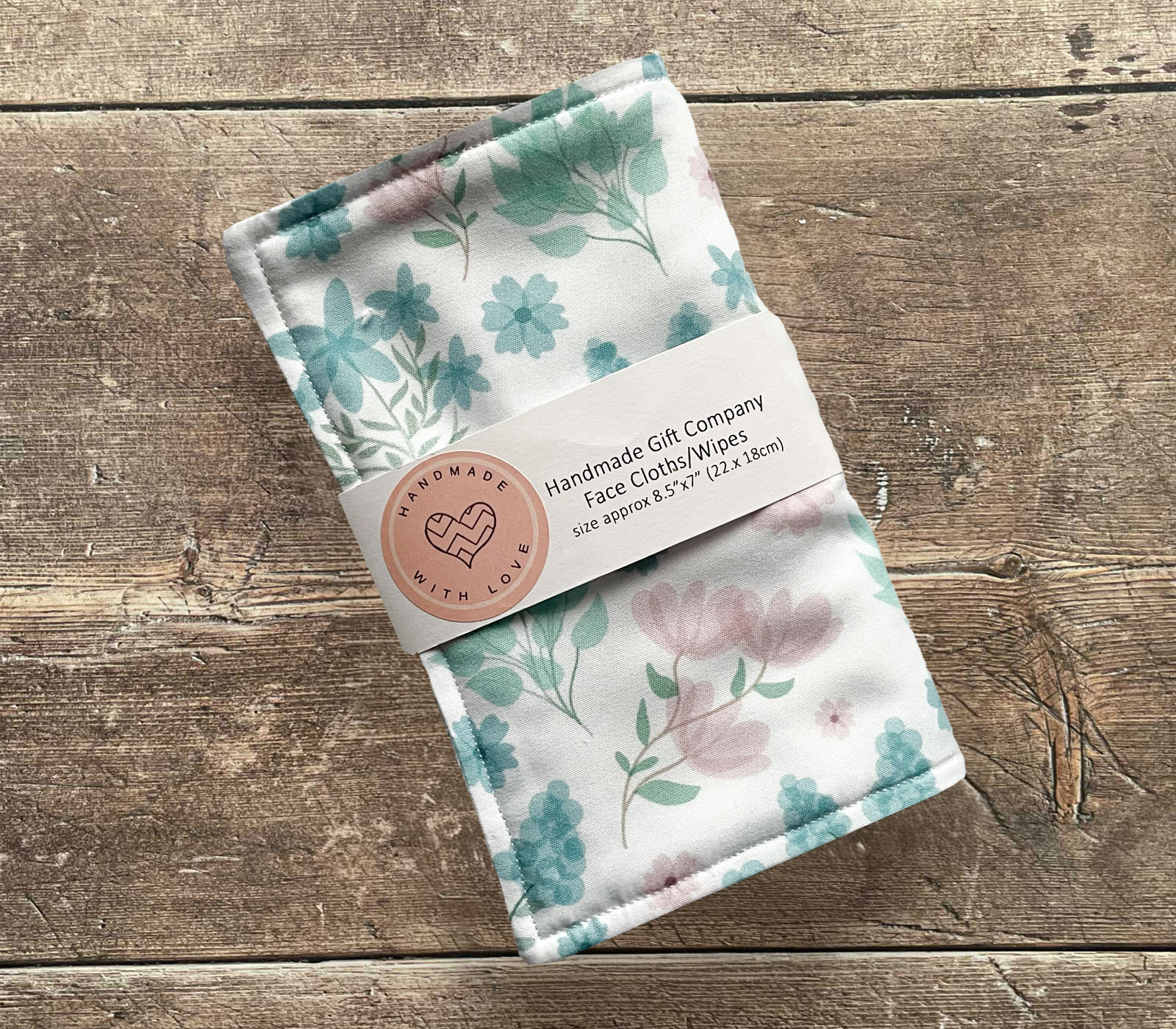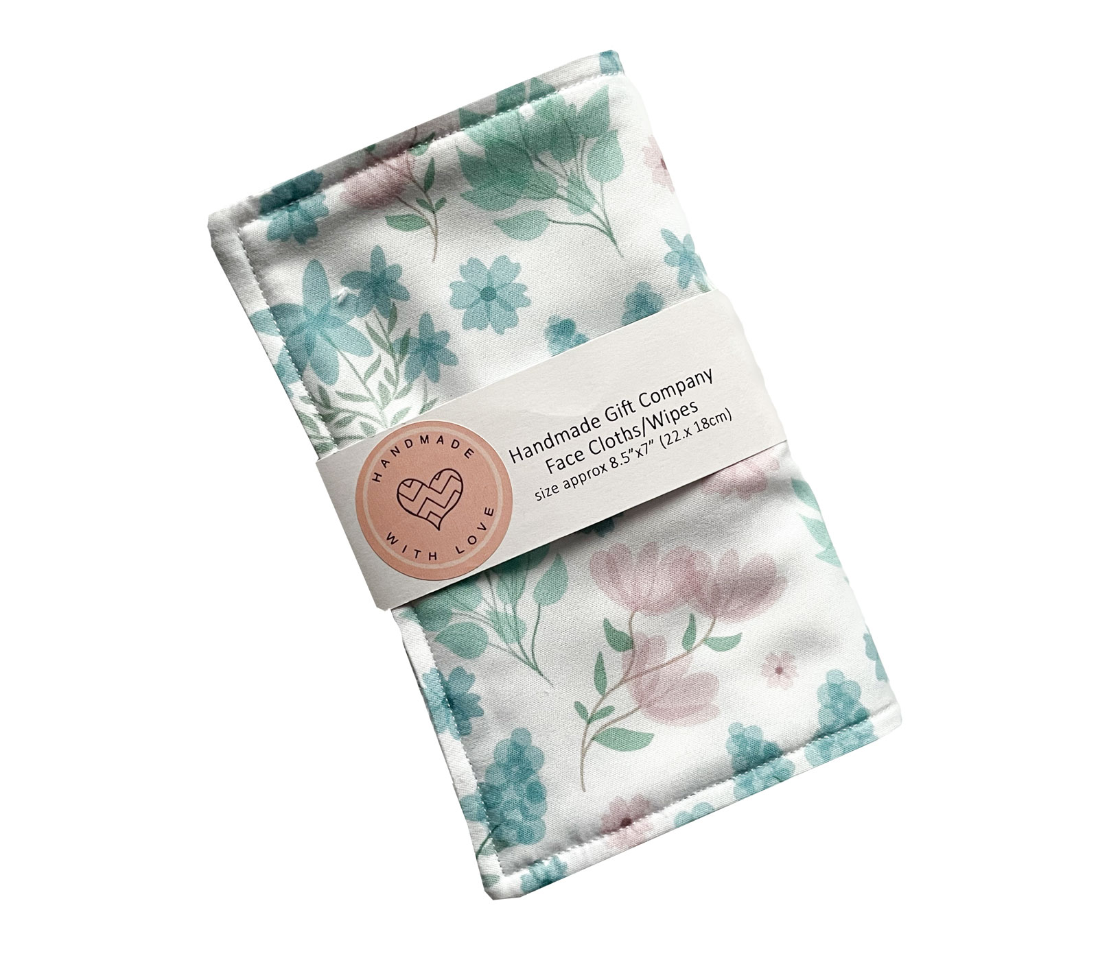 Handmade face cloth with a lovely pattern of mint green/pink flowers on a white fabric. This item comes as a pack of 2 face cloths in the same design