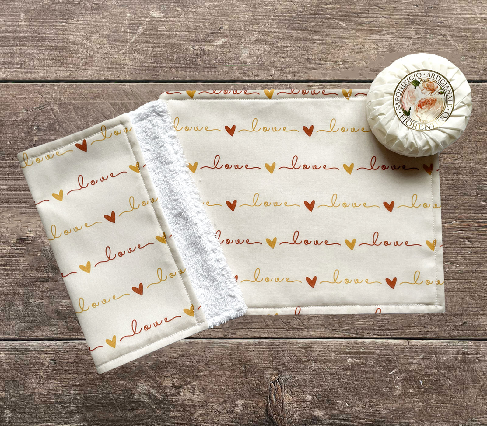 Handmade face cloth with a lovely design showing lots of little hearts and the word love on the fabric. This item comes as a pack of 2 face cloths in the same design