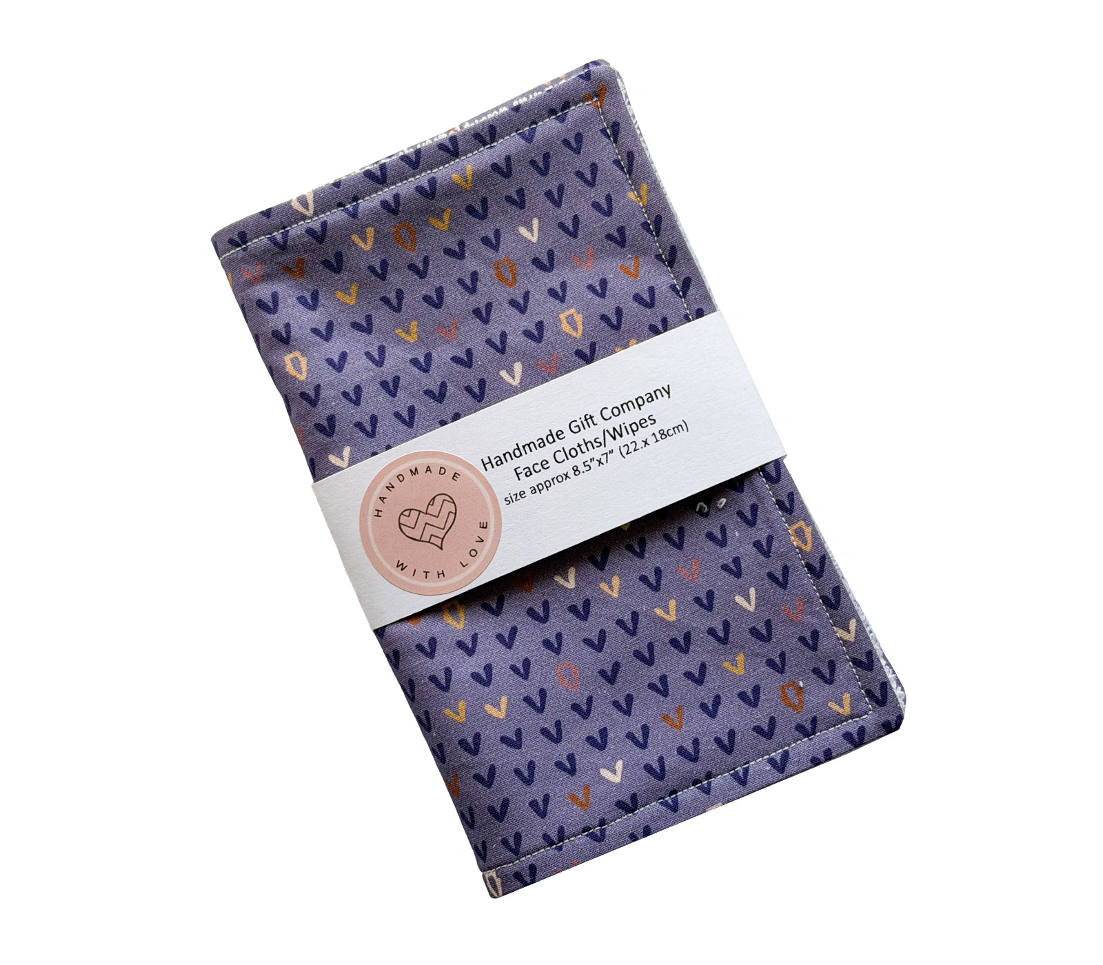 Handmade face cloth with a lovely design showing lots of little arrows on a purple fabric. This item comes as a pack of 2 face cloths in the same design