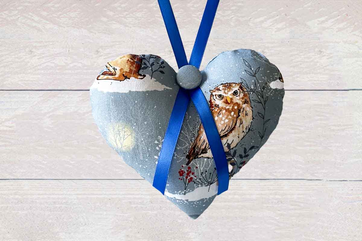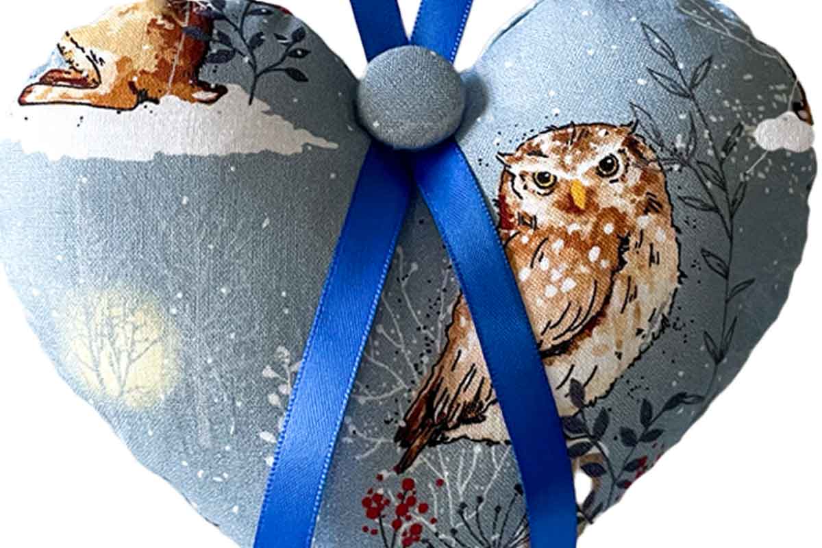 Lovely medium size hanging heart with a cute owl design on a blue fabric