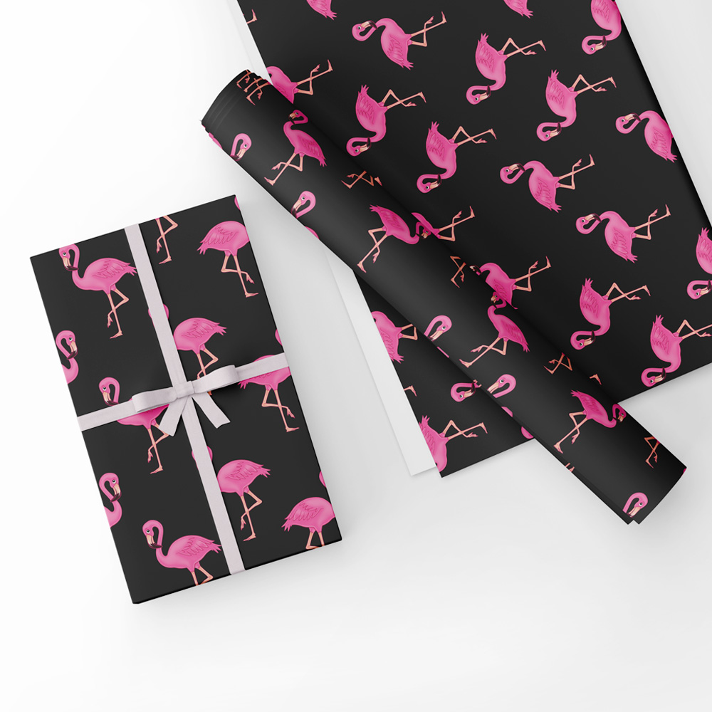 Lovely gift wrap with bright pink flamingos on a black background. This is high quality gift wrap designed by myself.