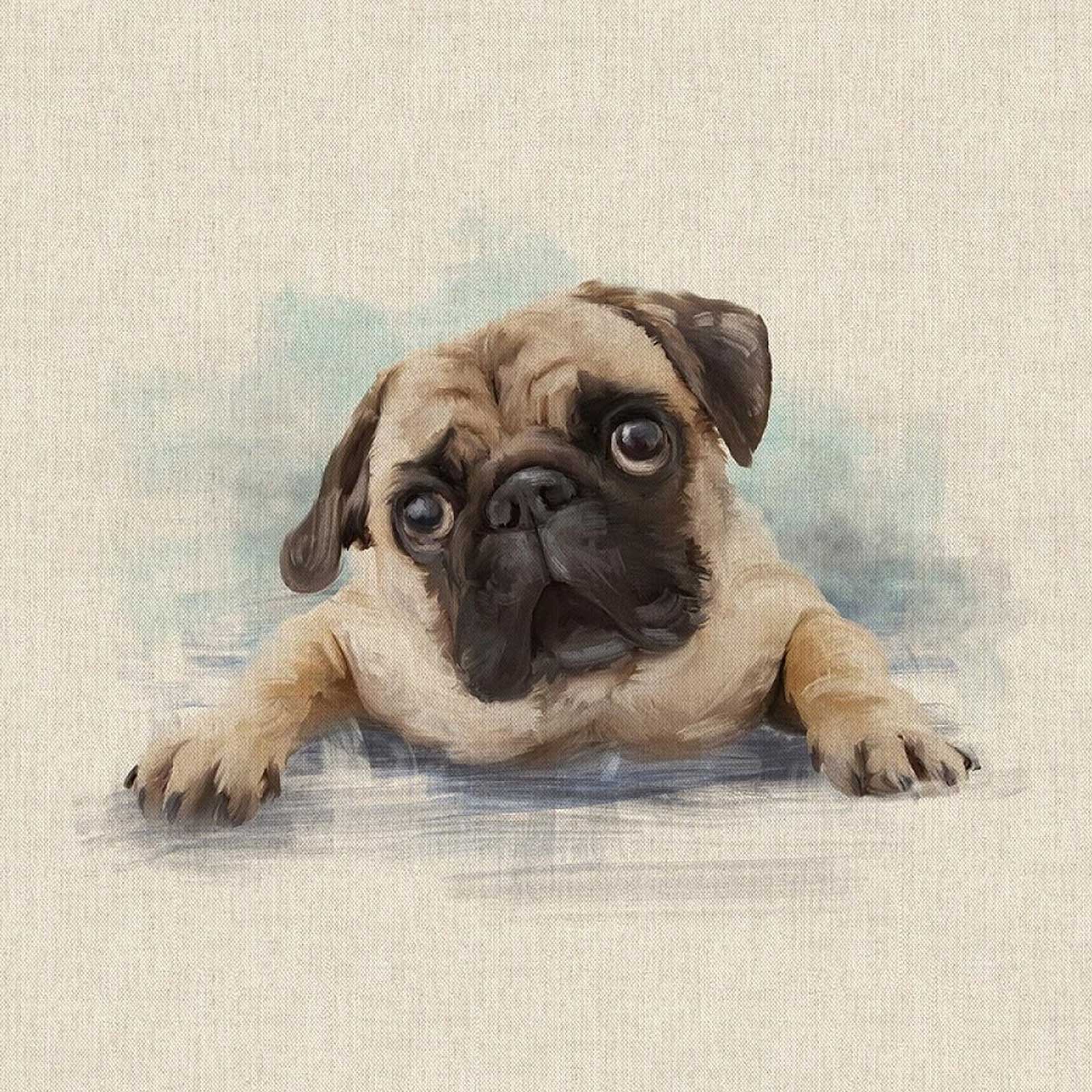 Lovely handmade cushion with a cute image of a single Pug on a linen fabric.