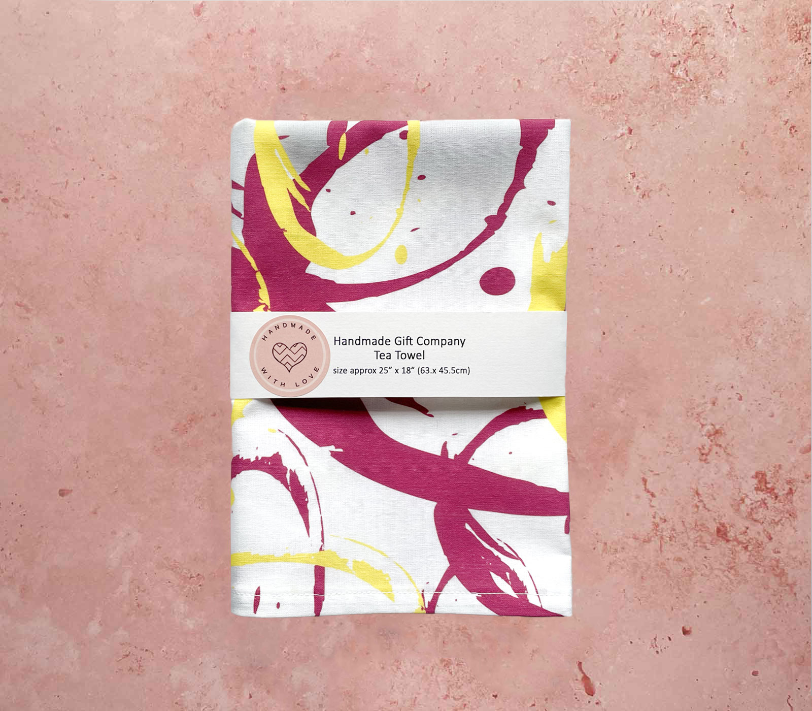 Handmade tea towel with a bright coloured design of paint splatters in burgundy and yellow colours
